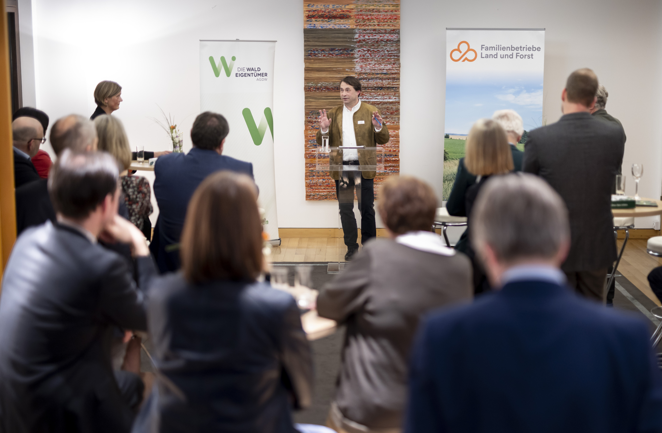 „Was braucht der Wald, damit er unser wichtigster Klimaschützer bleibt?“ Eine Frage, die auch das politische Berlin beschäftigt. Die AGDW und die Familienbetriebe Land und Forst haben am Dienstag, 15. März 2022, zu einem parlamentarischen Abend eingeladen, um diese Frage mit Vertreterinnen und Vertretern des Deutschen Bundestages und der Ministerien zu diskutieren. Zahlreiche Bundestagsabgeordnete und Mitarbeitende aus Parlament und Ministerien sind gekommen. AGDW-Vizepräsident Josef Ziegler, Max von Elverfeldt, Präsident der Familienbetriebe Land und Forst, Prof. Dr. Andreas Bolte vom Thünen-Institut haben mit den aktuellen Themen rund um Wald und Waldbesitzende eingeführt. Sie vermittelten den Abgeordneten anschaulich, was nachhaltige Forstwirtschaft bedeutet und wo die Politik unterstützen muss. Klare Botschaft: Wir brauchen jetzt den Mindestlohn für den Wald.