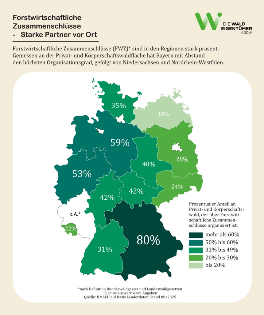 Spitzenreiter ist hier Bayern. Insgesamt 80 Prozent der Flächen des kommunalen und privaten Waldbesitzes sind in FWZ organisiert. Es folgen Niedersachsen und Nordrhein-Westfalen, wo 59 Prozent bzw. 53 Prozent der Privat- und Kommunalwaldflächen über FWZ bewirtschaftet sind. Knapp unter der 50 Prozent-Marke rangiert Sachsen-Anhalt mit 48 Prozent. Am anderen Ende des Spektrums sind in Mecklenburg-Vorpommern und im Saarland jeweils rund ein Fünftel der Privat- und Kommunalwaldflächen in FWZ organisiert.