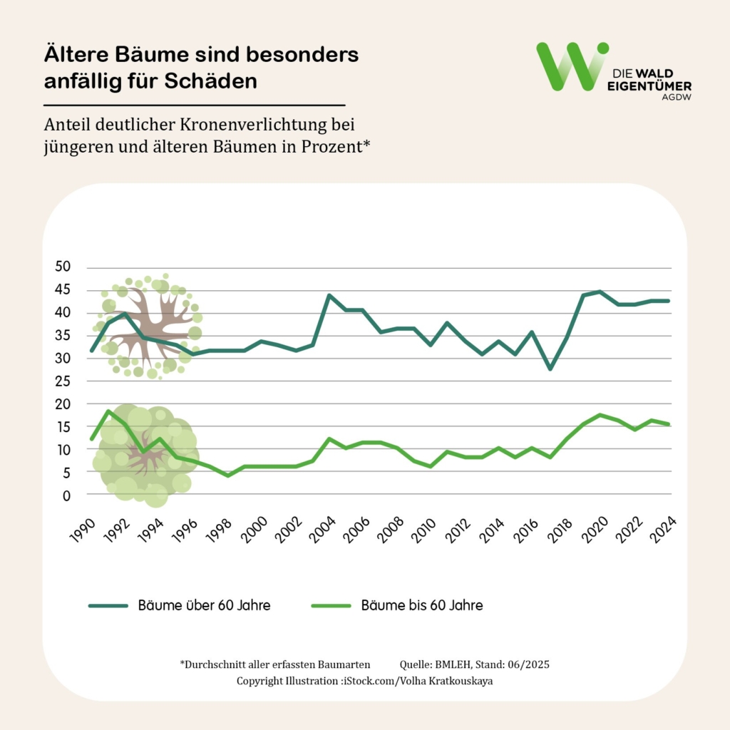 Bei den jüngeren Bäumen bis 60 Jahre haben hingegen wurden hingegen deutliche Kronenverlichtungen nur bei 16 Prozent der Bäume beobachtet.