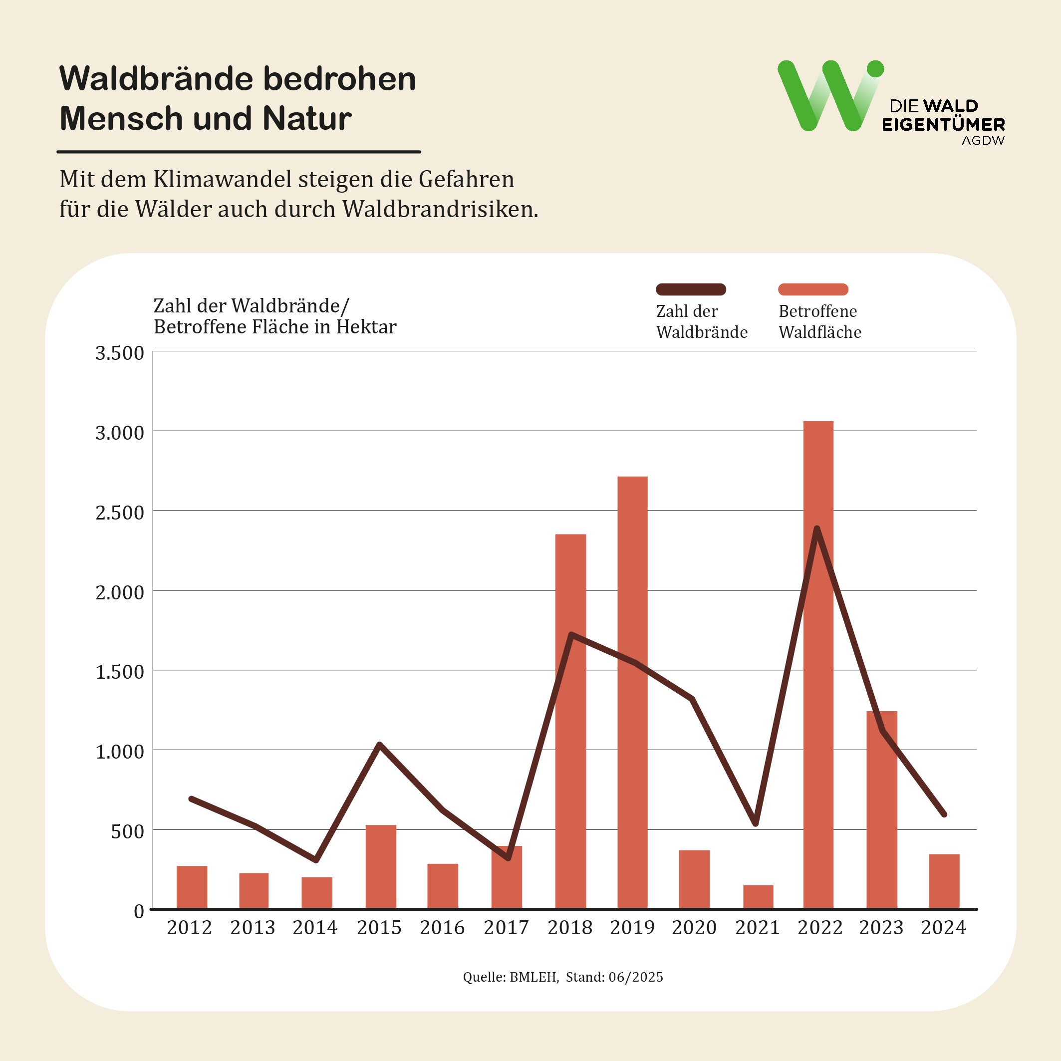 Brände gehören zu den größten Bedrohungen für den Wald – auch in Deutschland. Im Jahr 2024 wurden bundesweit 563 Waldbrände registriert, die sich auf eine Fläche von insgesamt 334 Hektar Wald erstreckten. Das Jahr 2024 mit seinen reichlichen Niederschlägen bot deshalb – im Bundesmittel – etwas Entspannung gegenüber den beiden Vorjahren.