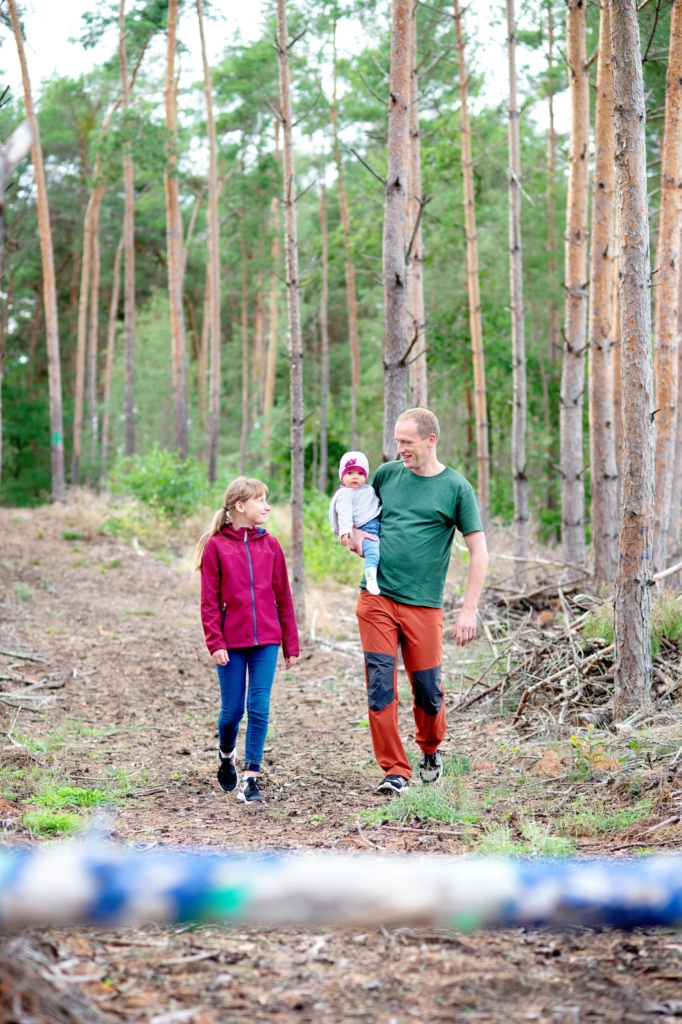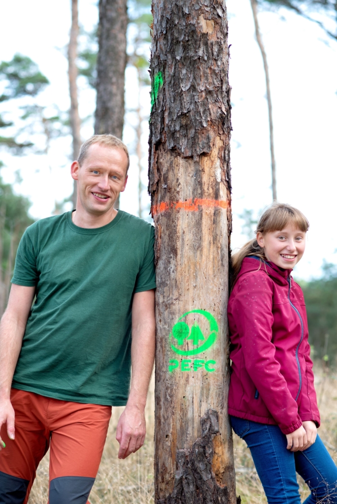 Folglich hat er die ursprünglichen Baumarten Eiche, Sandbirke und Kiefer erweitert um Edelkastanie, Elsbeere und Eberesche, Bergahorn, Weißtanne und Waldhasel, Douglasie, Lärche und Roteiche. Mit seiner Familie hat er einen Waldrand naturnah mit Schlehen, Hagebutten und Holunder umgestaltet. Der Brandenburger hat viel selbst gepflanzt und einiges der Natur überlassen. In seinen Wald sollen Fledermäuse einziehen und Vögel nisten. Dafür hat er Nistkästen oben an mehreren Bäumen angebracht und Totholz liegenlassen für seine Untermieter. Burkhardts Wald ist PEFC-zertifiziert: Er zeigt auf ein Schild, das er in seinem Wald aufgestellt hat, um deutlich zu machen, dass er sich der nachhaltigen Waldwirtschaft verpflichtet fühlt.