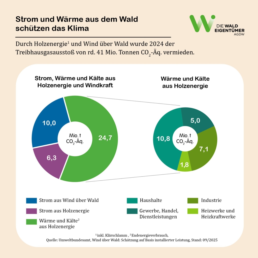 Strom liefert übrigens auch die Windenergie über dem Wald. Durch die Anlagen auf Forstflächen wurden 2024 bundesweit THG-Emissionen von rund 10 Mio. t CO2-Äquivalenten eingespart. Die heute aufgestellten Anlagen produzieren viel mehr Strom als ihre Vorgänger, so dass mit einer vergleichbaren Zahl an Windrädern deutlich mehr Elektrizität für Haushalte und Industrie entsteht.